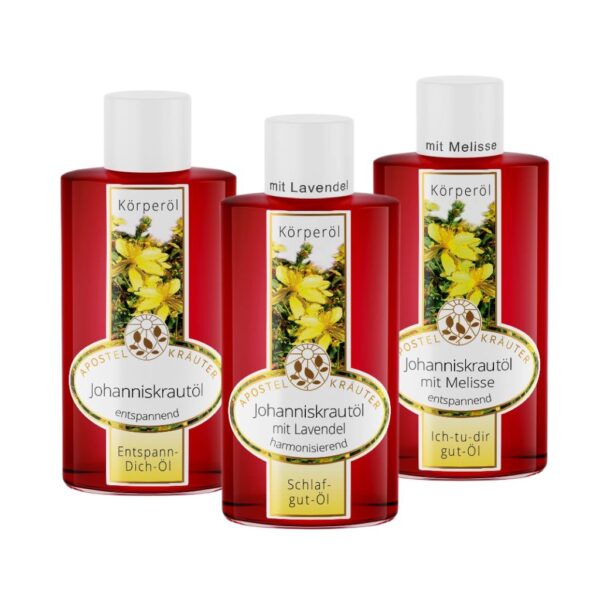 In diesem Set erhalten Sie unsere verschiedenen Sorten des Johanniskrautöls. Dazu gehören Johanniskrautöl pur Bio, Johanniskrautöl mit Lavendel und Johanniskrautöl mit Melisse.